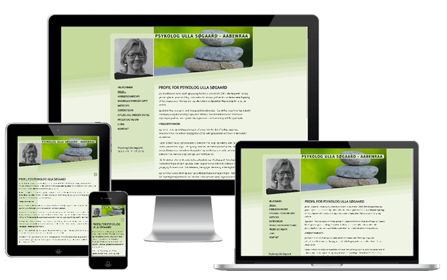 Denne WordPress hjemmeside til Psykolog Ulla Søgaard, som ønskede et grønt design der afspejlede hende og hendes arbejde som privatpraktiserende psykolog i Aabenraa.